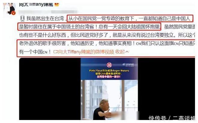 是以向太就转发了一位番邦退休歌手在禁受采访的技能,称台湾是中国一部分的视频。并暗示我方天然成就在台湾,从小在国民党一党专政的训诫下,一直知说念我方是中国东说念主。知说念我方暂时居住在中国幅员的台湾省,总有一天台湾省会归国故国的怀抱。咱们也只认一个国旗,只知说念唯唯一个中国。